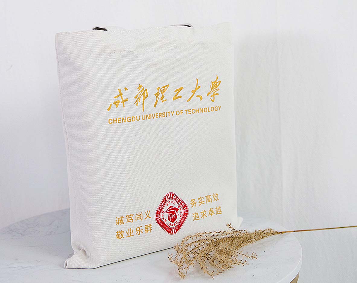 成都理工大學(xué)定制帆布袋定做是由成都米尺帆布袋廠家定制生產(chǎn),布料采用16安帆布制作,帆布袋印花為金色和紅色工藝。